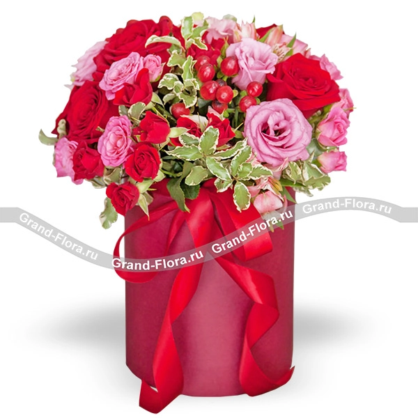 Уменьшенный: роза красная - 3 шт., роза кустовая розовая - 3 шт., эустома розовая - 1 шт.,гиперикум красный - 1 шт., декоративная зелень., оазис, коробка.